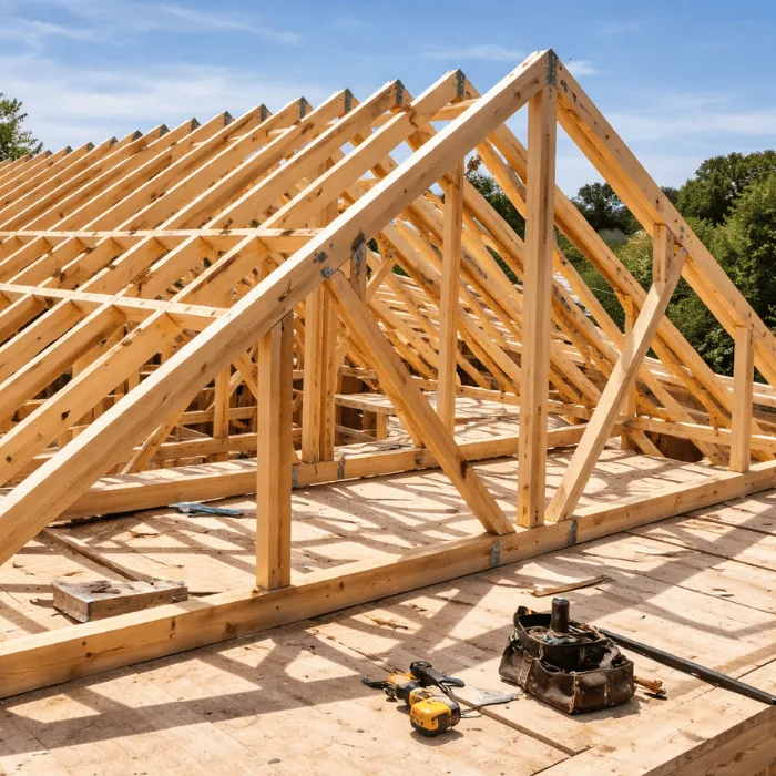 Nos charpentiers travaillent sur charpentes en bois massif, fermettes, poutres porteuses et structures anciennes, dans le respect des normes DTU et des règles de calcul structurel.